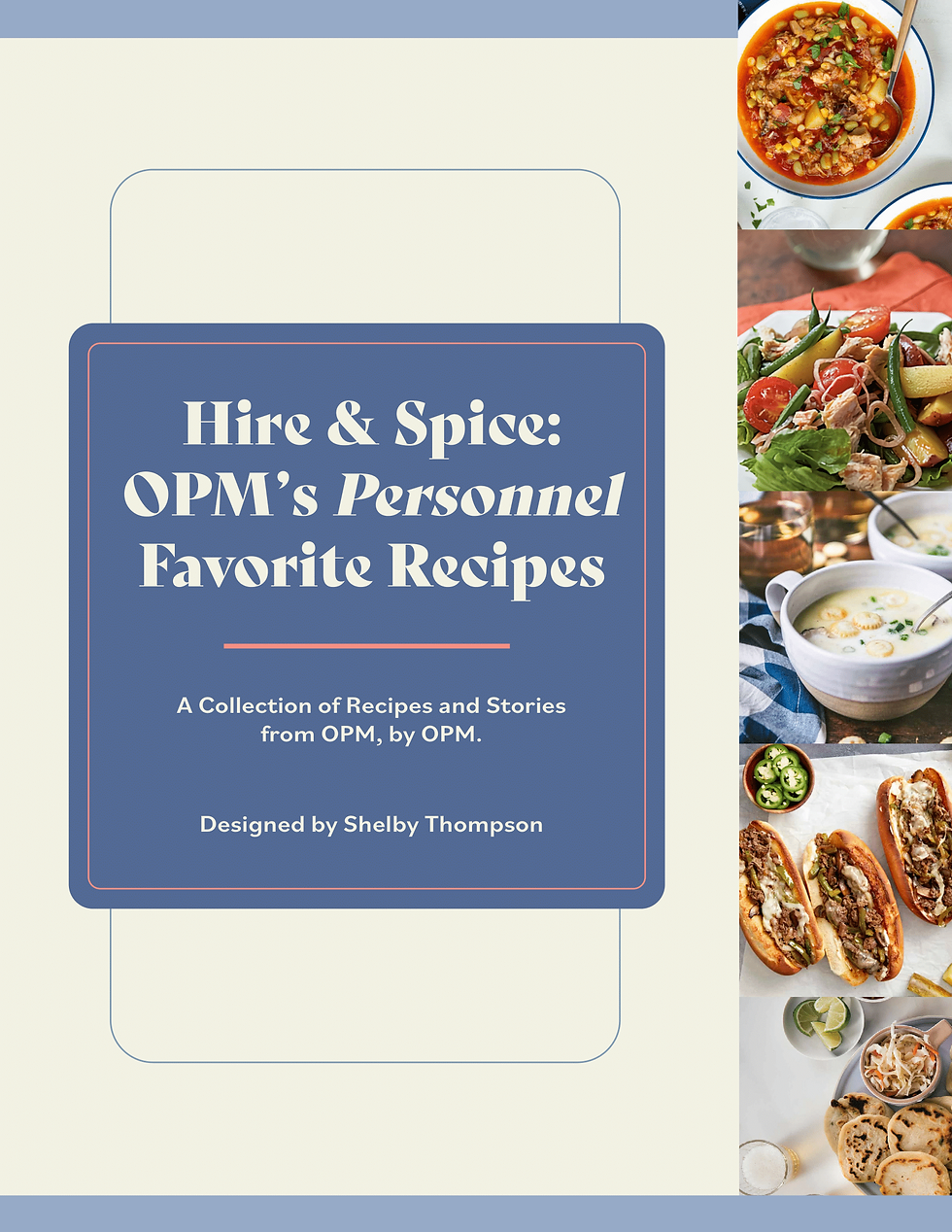 I was tasked to create a design for the OPM cookbook. The cookbook, titled “Hire & Spice: OPM's Personnel Favorite Recipes” is a series of recipes that are curated by employees across OPM.